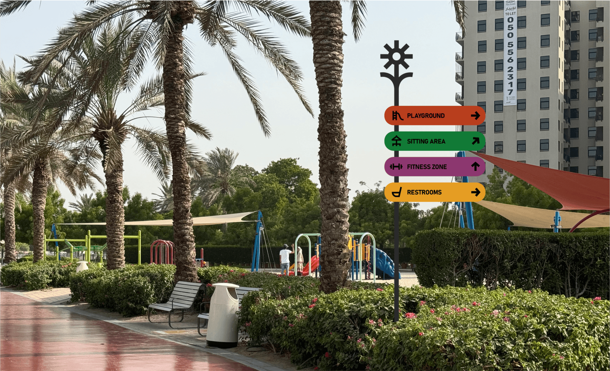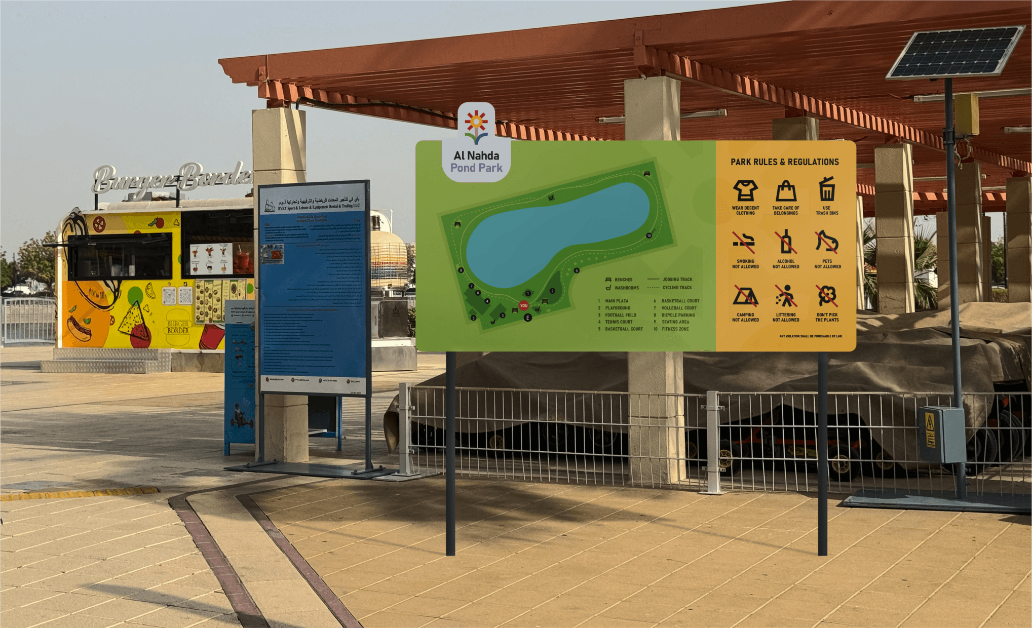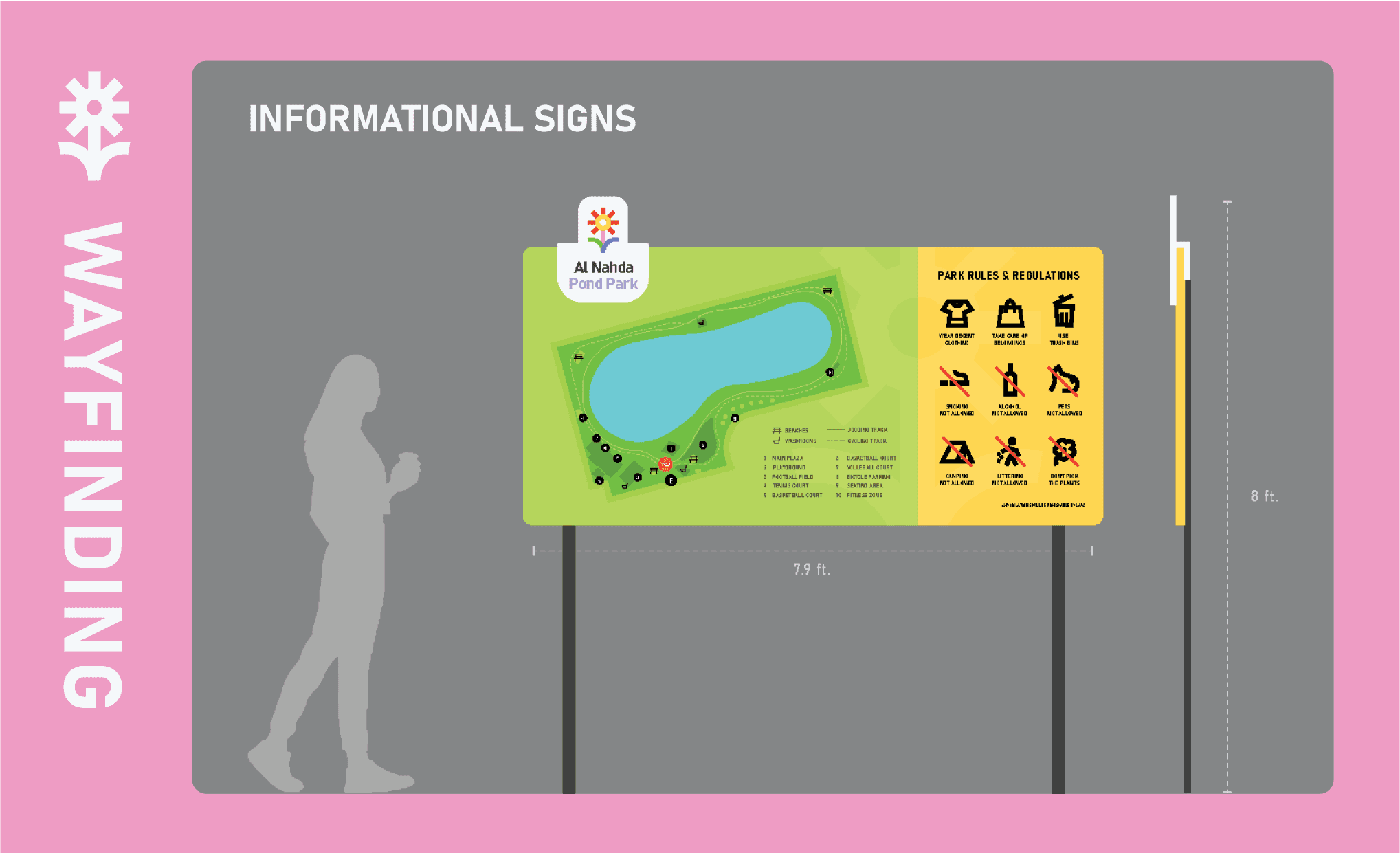 This project aims to improve Al Nahda Pond Park by providing the community of the park with a platform to find and maintain social connections around the park. This resulted in Nahda Connect, a social app where users can find people with similar interests that they can bond with at the park (Try it here!) Redesigning the signages around the park will help bring cohesiveness to park’s visual identity with the app.
